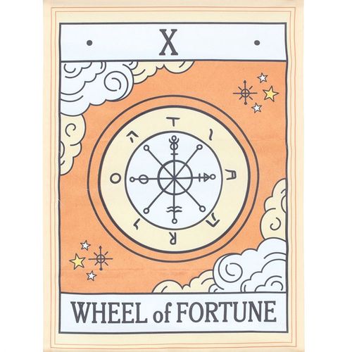 Brighten up your space with this The Wheel of Fortune tarot card fabric wall hanging featuring a stunning celestial design and a twine loop for easy display.